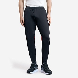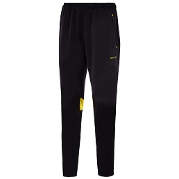 Спортивные брюки для интенсивных тренировок. Модель выполнена из прочной и износостойкой ткани с характерной текстурой. Такая ткань отличается своей водоотталкивающими свойствами и легкостью. Изделие сохраняют свою форму и не деформируется. Боковые карманы на молнии, на обратной стороне брюк на штанинах расположены молнии для быстрого переодевания спортсменов. Врезные вставки под коленями предназначены для удобства конструкции. Брюки имеют прямой крой и шнурки-утяжки для оптимизации посадки. Под утягивающим поясом с задней стороны и на обратной стороне штанин брюк, расположены вставки из сетчатого материала для равномерной и оптимальной вентиляции.