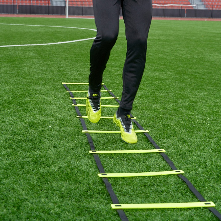 Тренажер лестница представляет собой компактную и переносную конструкцию с перекладинами или ступеньками, которые игроки могут использовать для тренировки беговой техники. Этот тренажёр, предназначен для развития скоростных навыков при выполнении движений на коротких дистанциях, а также для развития маневренности, силы, выносливости, координации движений и для синхронизации двигательных навыков.