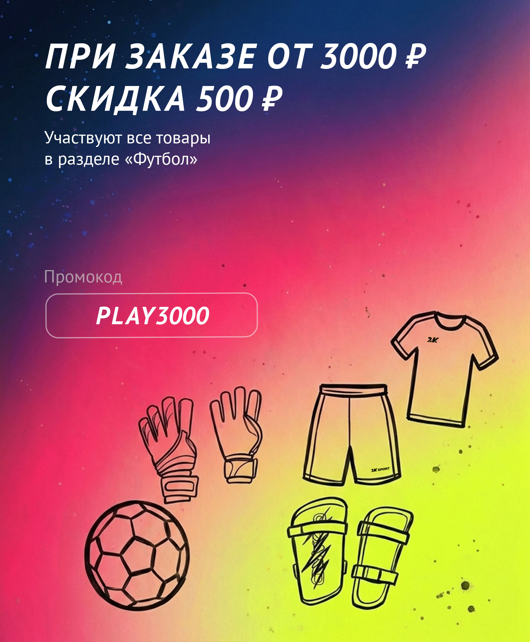 С 17 по 30 апреля 2026 года при заказе от 3000 рублей на товары из раздела «Футбол» вы получаете скидку 500 рублей. Введите промокод при оформлении заказа PLAY3000.